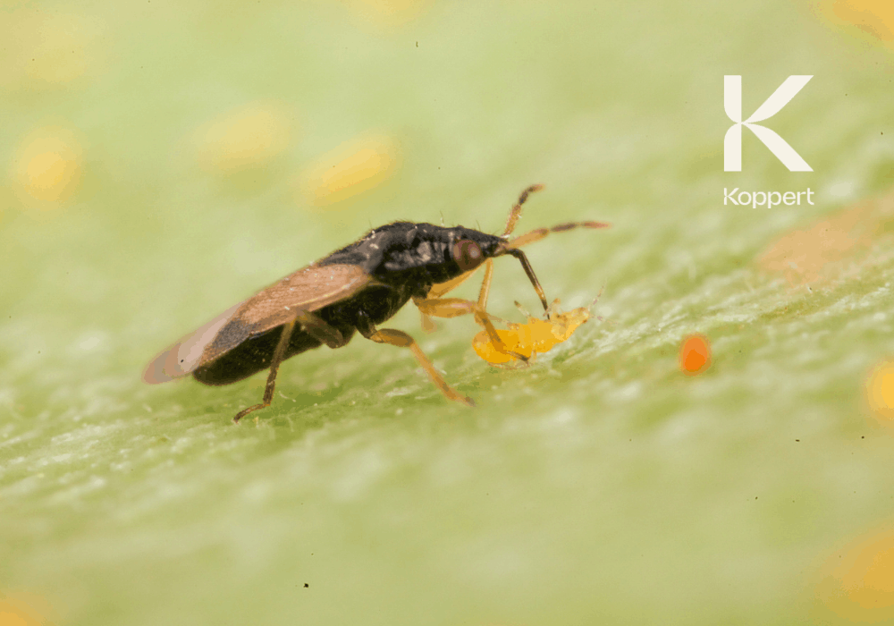 -Depredador activo de trips: Orius laevigatus se alimenta principalmente de larvas de trips y adultos, pero también puede atacar otras plagas como moscas blancas, ácaros y otros insectos pequeños.
